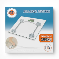 Balança digital de banheiro Fenima, suporta até 180kg, display digital, base de vidro temperado e desligamento automático.