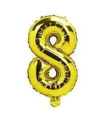 Balão metalizado em formato de número 8, cor dourada, com aproximadamente 40 cm. Ideal para aniversários, eventos e comemorações.