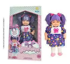 Boneca Maricotinha com cabelos de lã roxos e vestido florido. Ideal para crianças acima de 3 anos.