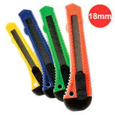 Estilete Plástico BRW com lâmina de 18mm, sistema com trava e estrutura reforçada, nas cores azul, amarelo e verde.