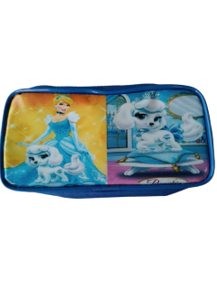 Estojo infantil decorado com tema de princesa azul, com detalhes vibrantes e material resistente, ideal para crianças a partir de 6 anos.