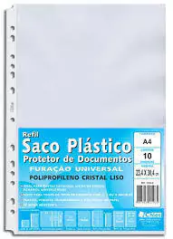 Protetor plástico de documento tamanho A4 com furação universal, ideal para pastas e fichários.